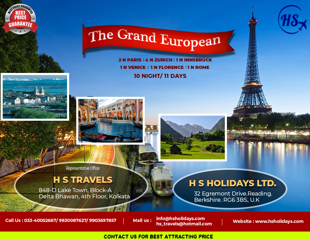 The Grand European 10N / 11D 11 Days Overview Trip Details 2 N Paris 4 N Zurich 1 N Innsbruck 1 N Venice 1 N Florence 1 N Rome Date & Time Package Type Back Continue You can send your enquiry via the form below. Trip name: * The Grand European 10N / 11D Your name: * Your email: * Country * Choose a country*AfghanistanĂ…land IslandsAlbaniaAlgeriaAmerican SamoaAndorraAngolaAnguillaAntarcticaAntigua and BarbudaArgentinaArmeniaArubaAustraliaAustriaAzerbaijanBahamasBahrainBangladeshBarbadosBelarusBelgiumBelauBelizeBeninBermudaBhutanBoliviaBonaire, Saint Eustatius and SabaBosnia and HerzegovinaBotswanaBouvet IslandBrazilBritish Indian Ocean TerritoryBruneiBulgariaBurkina FasoBurundiCambodiaCameroonCanadaCape VerdeCayman IslandsCentral African RepublicChadChileChinaChristmas IslandCocos (Keeling) IslandsColombiaComorosCongo (Brazzaville)Congo (Kinshasa)Cook IslandsCosta RicaCroatiaCubaCuraçaoCyprusCzech RepublicDenmarkDjiboutiDominicaDominican RepublicEcuadorEgyptEl SalvadorEquatorial GuineaEritreaEstoniaEthiopiaFalkland IslandsFaroe IslandsFijiFinlandFranceFrench GuianaFrench PolynesiaFrench Southern TerritoriesGabonGambiaGeorgiaGermanyGhanaGibraltarGreeceGreenlandGrenadaGuadeloupeGuamGuatemalaGuernseyGuineaGuinea-BissauGuyanaHaitiHeard Island and McDonald IslandsHondurasHong KongHungaryIcelandIndiaIndonesiaIranIraqIrelandIsle of ManIsraelItalyIvory CoastJamaicaJapanJerseyJordanKazakhstanKenyaKiribatiKuwaitKyrgyzstanLaosLatviaLebanonLesothoLiberiaLibyaLiechtensteinLithuaniaLuxembourgMacaoNorth MacedoniaMadagascarMalawiMalaysiaMaldivesMaliMaltaMarshall IslandsMartiniqueMauritaniaMauritiusMayotteMexicoMicronesiaMoldovaMonacoMongoliaMontenegroMontserratMoroccoMozambiqueMyanmarNamibiaNauruNepalNetherlandsNew CaledoniaNew ZealandNicaraguaNigerNigeriaNiueNorfolk IslandNorthern Mariana IslandsNorth KoreaNorwayOmanPakistanPalestinian TerritoryPanamaPapua New GuineaParaguayPeruPhilippinesPitcairnPolandPortugalPuerto RicoQatarReunionRomaniaRussiaRwandaSaint BarthélemySaint HelenaSaint Kitts and NevisSaint LuciaSaint Martin (French part)Saint Martin (Dutch part)Saint Pierre and MiquelonSaint Vincent and the GrenadinesSan MarinoSão Tomé and PríncipeSaudi ArabiaSenegalSerbiaSeychellesSierra LeoneSingaporeSlovakiaSloveniaSolomon IslandsSomaliaSouth AfricaSouth Georgia/Sandwich IslandsSouth KoreaSouth SudanSpainSri LankaSudanSurinameSvalbard and Jan MayenSwazilandSwedenSwitzerlandSyriaTaiwanTajikistanTanzaniaThailandTimor-LesteTogoTokelauTongaTrinidad and TobagoTunisiaTurkeyTurkmenistanTurks and Caicos IslandsTuvaluUgandaUkraineUnited Arab EmiratesUnited Kingdom (UK)United States (US)United States (US) Minor Outlying IslandsUruguayUzbekistanVanuatuVaticanVenezuelaVietnamVirgin Islands (British)Virgin Islands (US)Wallis and FutunaWestern SaharaSamoaYemenZambiaZimbabwe Contact number: * No. of Adults * No. of children Enquiry Subject: * Your Message *